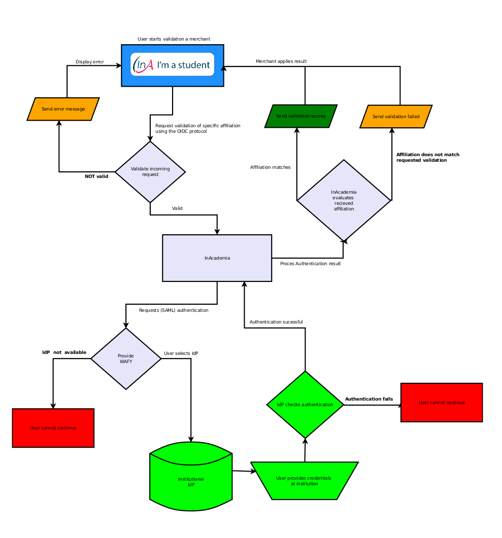The figure presents the 'happy' flow, ending in a successful validation, as displayed in green, as well the possible error scenarios represented in red or orange. The error situation where a institutional IdP, or teh merchant redirect URL component cannot be reached because of network issues or similar is not take into account as that is out of scope and control for InAcademia and will always yield an some error in the users browser.