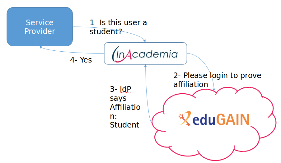 In the following diagram, light blue represents the merchant web shop, grey blue is InAcademia functionality. Institutional Identity Provider is represented in Green.
