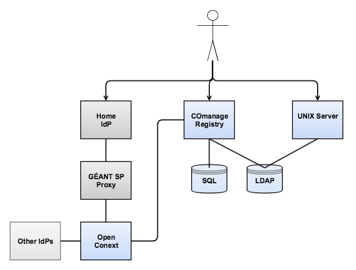 - LDAP Server, provisioned by COmanage and used by the UNIX Server as a source of account information