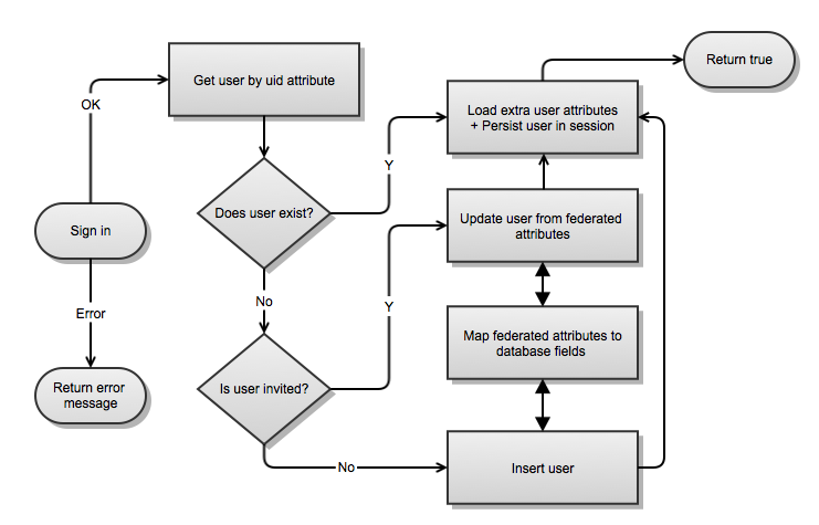 CORE uses federated login to authenticate users. After a user is successfully authenticated CORE checks the local user database to see if the user exists. It then loads all the user data (user role, presentations by this user, submissions by this user, etc.) and persists the user in a session. See diagram for a complete overview.