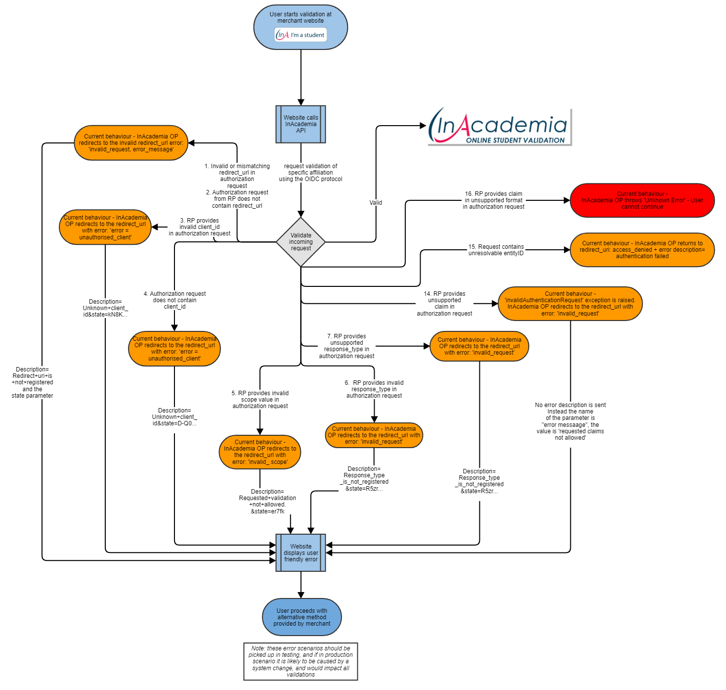 The figure presents the 'happy' flow, ending in a successful validation, as displayed in green, as well the possible error scenarios represented in red or orange. The error situation where a institutional IdP, or the merchant redirect URL component cannot be reached because of network issues or similar is not take into account as that is out of scope and control for InAcademia and will always yield an some error in the users browser. The InAcademia service is part of a continuing development programme and additional features planned for the future are also captured below.