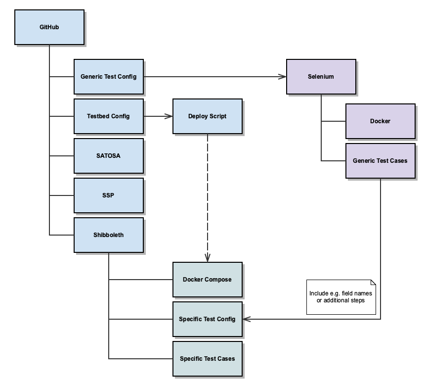 The architecture of the testbed is based on the use of self-containing containers (Docker) for the software products (IdP, SP, Proxy). These containers are maintained by a product maintainer and made available at a location of their choice (e.g. Docker Hub). The key component of the testbed is a centrally managed repository (GitHub) that contains the configurations of all products, i.e. deployment and test instructions. A user only has to clone the central repository and can then select the required software products and have it deployed in a target environment (e.g. local or cloud). In addition, the testbed provides a way to run automated web-based tests using Selenium, which are tailored to the selected software products.