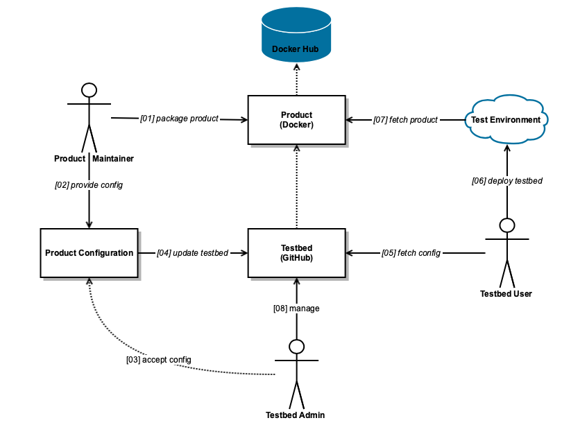 The administrator is the owner of the testbed GitHub repository. He is responsible for the general testbed configuration and the generic tests. The administrator can add new products to the testbed by creating corresponding subdirectories and passing them on to the maintainer.