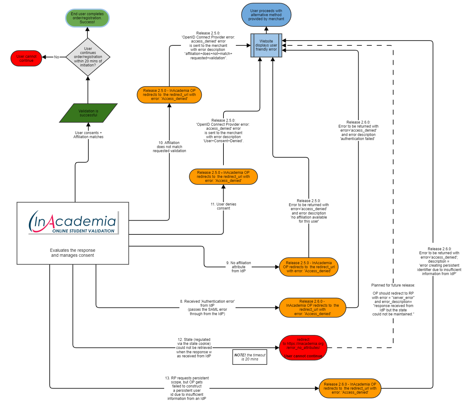 The figure presents the 'happy' flow, ending in a successful validation, as displayed in green, as well the possible error scenarios represented in red or orange. The error situation where a institutional IdP, or the merchant redirect URL component cannot be reached because of network issues or similar is not take into account as that is out of scope and control for InAcademia and will always yield an some error in the users browser. The InAcademia service is part of a continuing development programme and additional features planned for the future are also captured below.