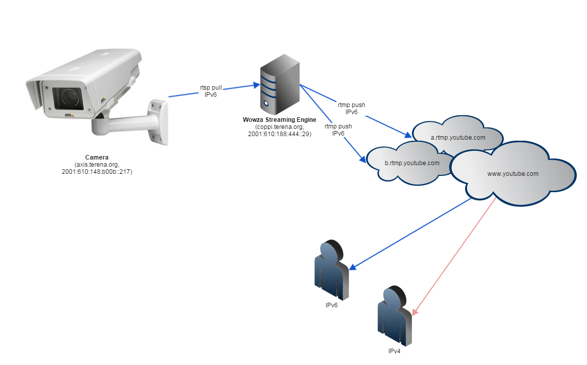 . - Production side can be purely IPv6 (despite the general rule "What an engineer can do, is rarely what he should do "). Both the camera and the relaying system do not need to be publicly available. The camera just needs to communicate with the relaying system, which in turn needs to talk to YouTube. Since YouTube is dual stack, this means that both the camera and the relaying system can be purely IPv6.