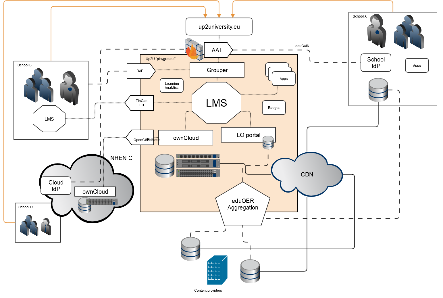 There was a consensus about the need of a central LMS system that Up2U provides to all schools willing to participate in piloting without their own LMS. Moodle is the choice to start with. Must be pluggable to swap if decided.