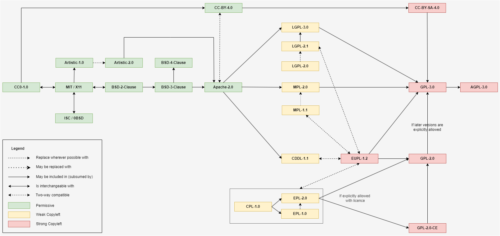 In Figure 1, different colours indicate categories of software licences. Licences marked in green are permissive, those in yellow are weak copyleft and those in red are strong copyleft. Relationships between licences are illustrated using different arrow styles: