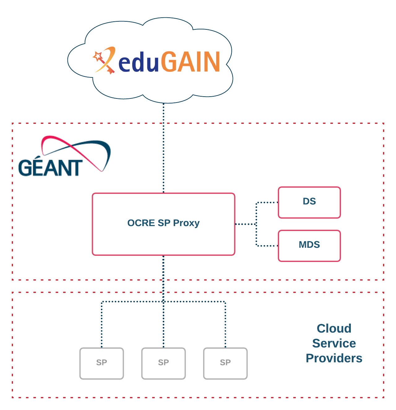The GEANT Service Provider Proxy for OCRE (OCRE SP Proxy) is a service provided by GEANT with the purpose of enabling Cloud Service Providers which participate in the OCRE framework to authenticate users at Academic Identity Providers and/or Community Authentication and Authorization Infrastructure Services in the context of the European Open Science Cloud through the eduGAIN Interfederation Service.