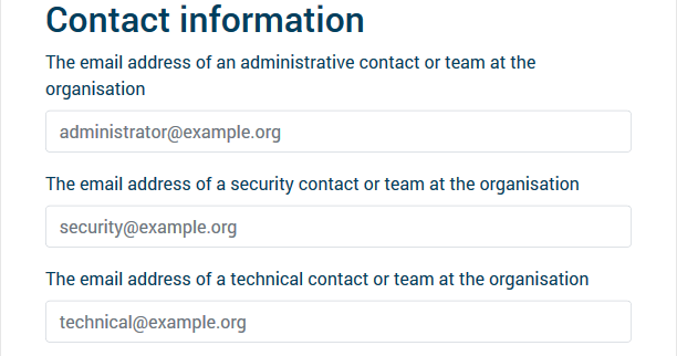 Email addresses for administrative, security and technical contacts or teams responsible for the service