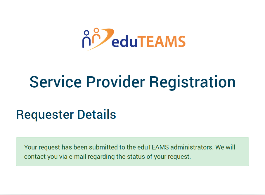 When you click on the "Submit" button, you will see a page confirming your application request. You application will be reviewed by the eduTEAMS Support team and you will be notified via e-mail.