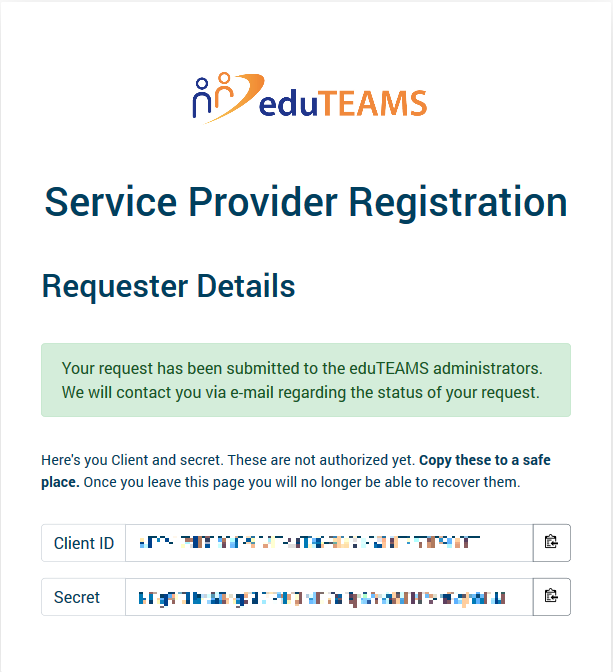 When you click on the "Submit" button, you will see a page confirming your application request. In the confirmation page you will see also th client_id and secret for your client. Please store the securely as these cannot retreived later. You application will be reviewed by the eduTEAMS Support team and you will be notified via e-mail.