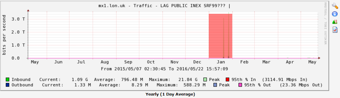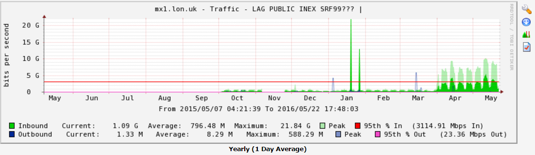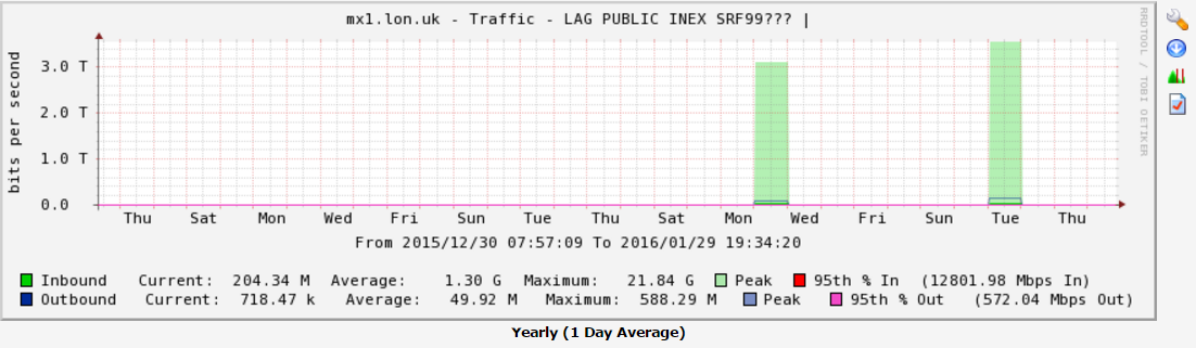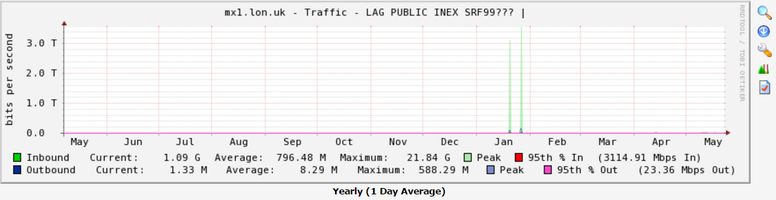 NOTE: The values in the RRD file are in bytes per second. You will need to multiple these values by 8 to obtain the bits per second. The graphs on the website and CSV files that can be downloaded from the website all show the traffic levels in bits per second.